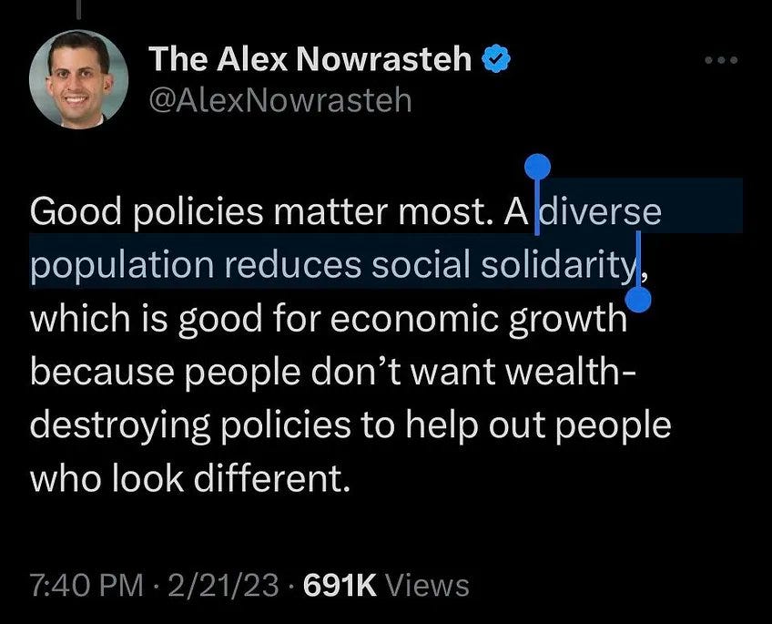 They make their disdain for American culture explicit: Alex Nowrasteh, senior vice president for policy at the Cato Institute, writes that he wants to “reduce social solidarity” in the name of “economic growth.” This is a cold-blooded, sociopathic tradeoff: our social fabric for a few fraudulent points of GDP.