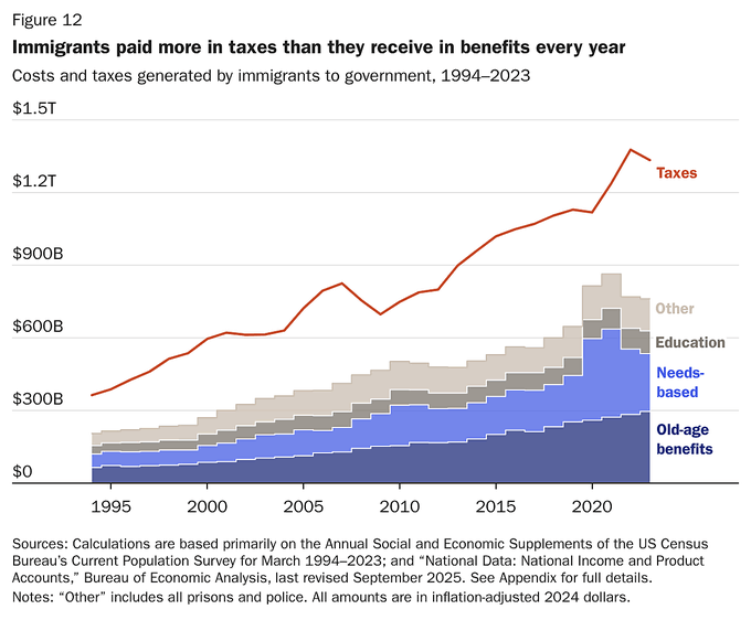 The Cato Institute’s primary vehicle for advancing its agenda is a relentless stream of “empirical” economic studies designed to frame mass immigration—both legal and illegal—as an unambiguous good for the economy. Their latest publication, Immigrants’ Recent Effects on Government Budgets: 1994–2023, is perhaps their most audacious claim to date. Released last week, the study asserts that immigrants contributed a net $14.5 trillion to the U.S. treasury over the last three decades, purportedly narrowing the federal budget deficit by one-third in real terms.